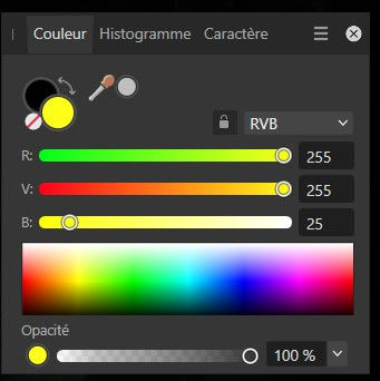 Toujours à partir de ce calque, je choisis une couleur de modification que je trouve dans la palette couleurs et je la mets au premier plan : ici le jaune.